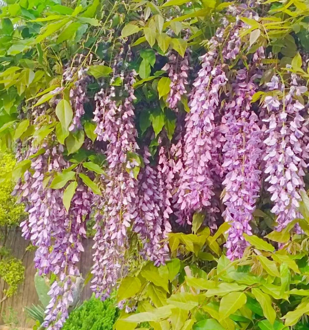 Com o solo adequado e luz solar suficiente, a glicínia desenvolve-se rapidamente, cobrindo pérgolas, cercas e muros com um folhagem exuberante.